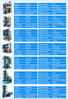 BMT100 | 10T | 82.6 kW | 40 kW | 80A | 33.8 kW | R22/R404A | Eau/évaporation | 1490*900*1850 |